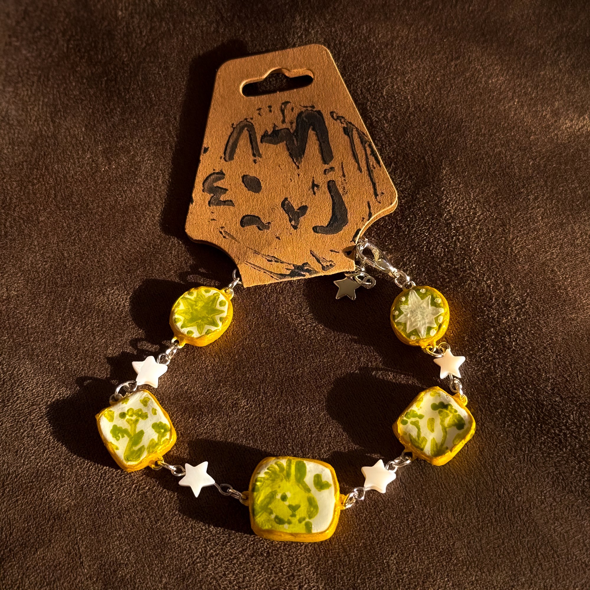 Hand-sculpted and painted with stars, flowers, and a bunny to centre.