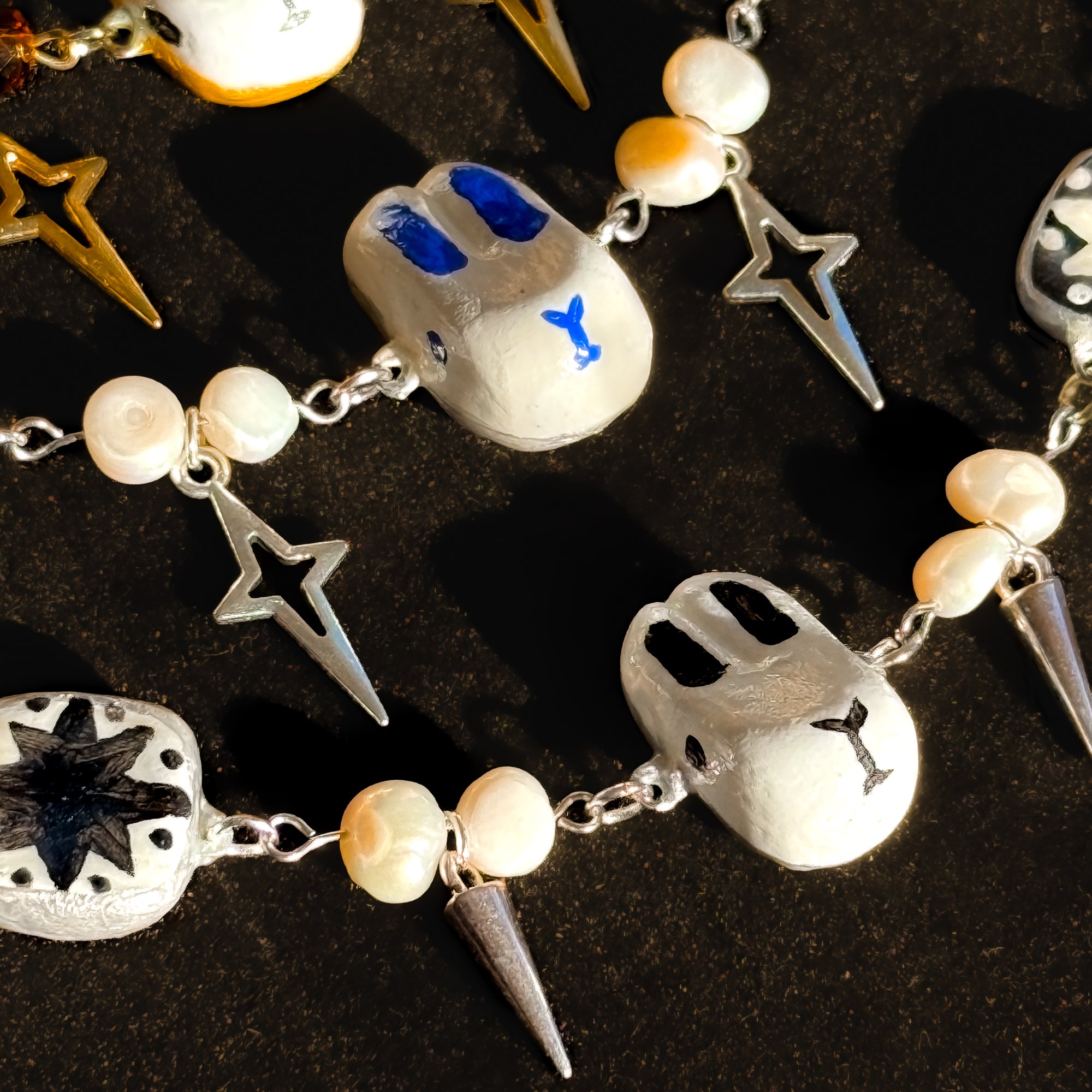 5 clay charms featuring flowers, stars, and a bunny head to centre.